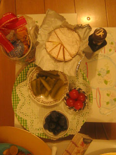 ちょっとしたおつまみにはチーズ、ピクルス、オリーズ、トマト。
