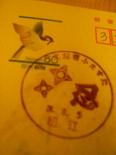 5日に、島根県の松江で忍者イベントをやっていたらしく、そのイベントに参加された方から、忍者消印付きのお葉書が届いた!